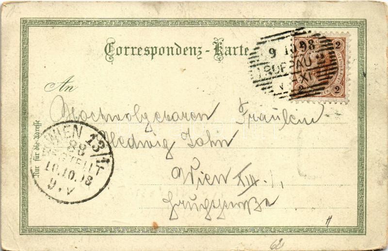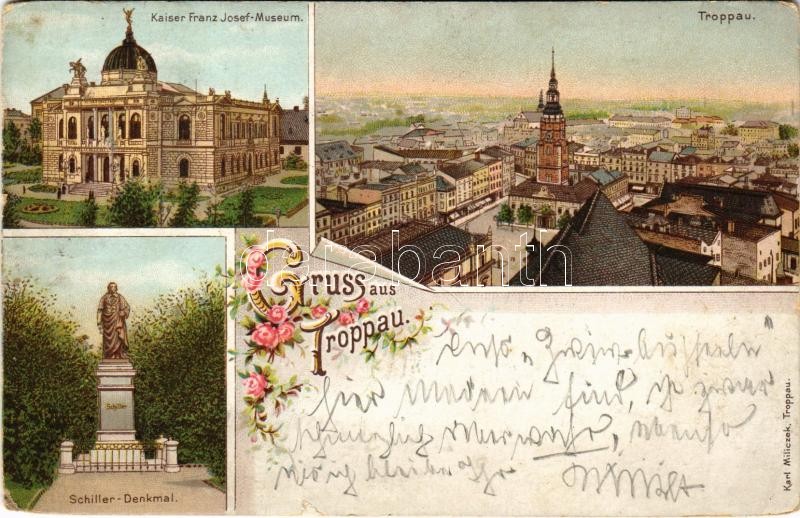 Leírás: 1898 (Vorläufer) Opava, Troppau; Kaiser Franz Josef Museum, Schiller Denkmal / museum, statue. Karl Miliczek Art Nouveau, floral, litho (EK)