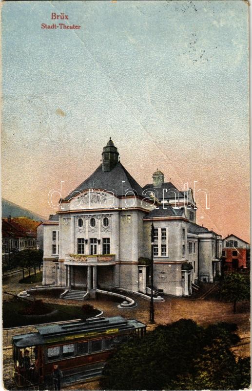 1923 Most, Brüx; Stadt-Theater / theatre, tram (fa) https://www.darabanth.com/hu/38-Nagyaukcio/38.1/Kepeslapok/Cseh-Koztarsasag~15666/1923-Most-Brux-Stadt-Theater-theatre-tram-fa~II2577637