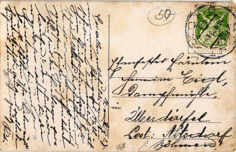 Leírás: 1923 Most, Brüx; Stadt-Theater / theatre, tram (fa)
