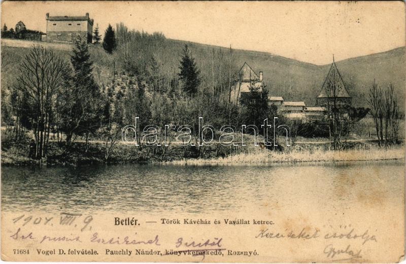Leírás: 1904 Betlér, Betliar (Rozsnyó, Roznava); Török kávéház és Vadállat ketrec. Vogel D. felvétele, Pauchly Nándor kiadása / Turkish cafe,