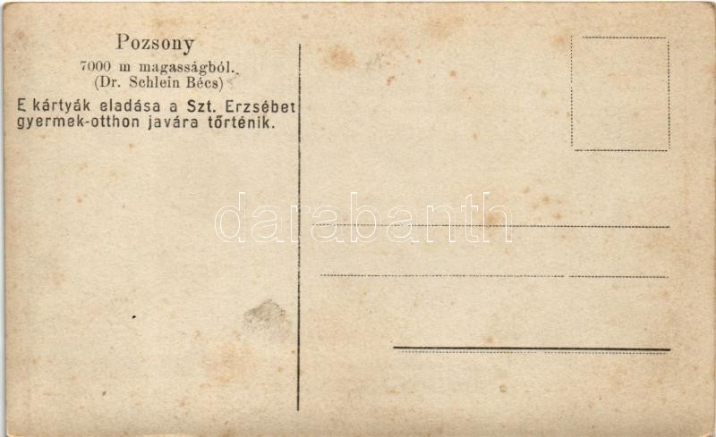 Pozsony, Pressburg, Bratislava; Légi felvétel 7000 m magasságból (Dr. Schlein Bécs), hőlégballon. E kártyák eladása a Szt. Erzsébet gyermek otthon javára történik / air balloon, aerial view. photo (fl)