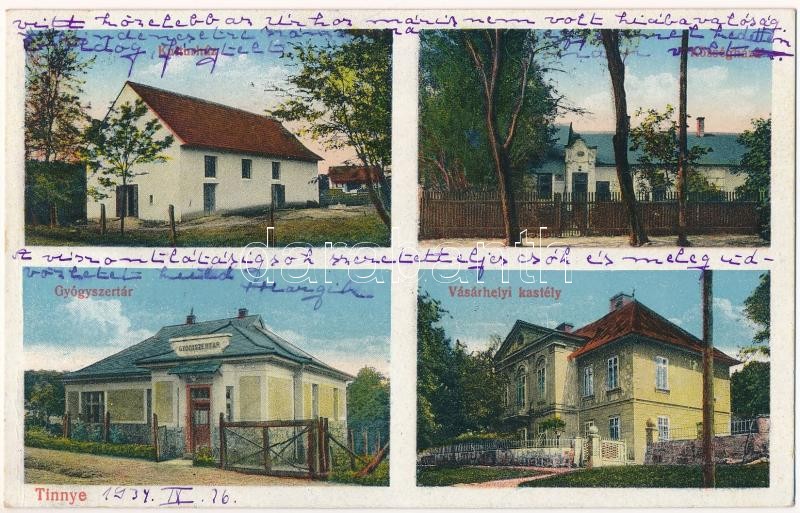 1934 Tinnye, kultúrház, Vásárhelyi kastély, gyógyszertár, községháza https://www.darabanth.com/hu/38-Nagyaukcio/38.1/Kepeslapok/Magyarorszag~15644/1934-Tinnye-kulturhaz-Vasarhelyi-kastely-gyogyszertar-kozseghaza~II2614010