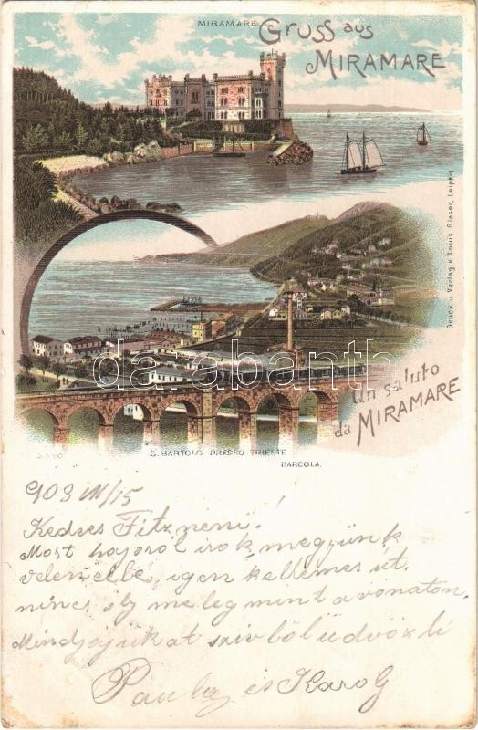 1903 Trieste, Gruss aus Miramare, S. Bartolo Barcola / castle, railway... https://www.darabanth.com/hu/38-Nagyaukcio/38.1/Kepeslapok/Olaszorszag~15710/1903-Trieste-Gruss-aus-Miramare-S-Bartolo-Barcola-castle-railway-bridge-locomotive-Louis-Gla~II2362077