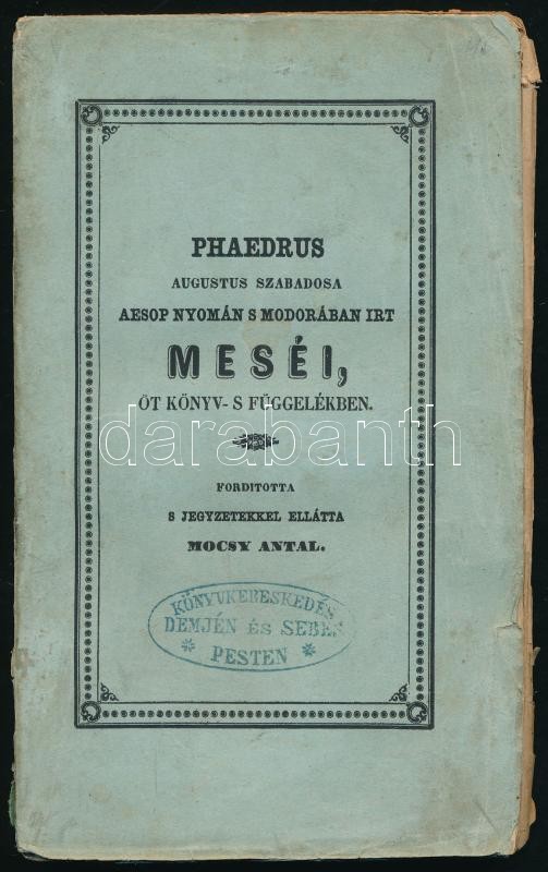 [Caius Iulius Phaedrus (Kr. e. 15 - Kr. u. 55)] Phaedrus Augustus szabadosa Aesop nyomán s modorában írt meséi, öt könyv- s függelékben. Forditotta s jegyzetekkel ellátta Mocsy Antal. Kecskemét, 1855., Szilárdy Károly, 22-144+23 p. Kiadói papírkötés, kissé szakadt, kissé foltos borítóval, kissé sérült gerinccel, kissé foltos lapokkal, "Demjén és Sebes Könyvkereskedés Pesten" bélyegzésével a címlapon.