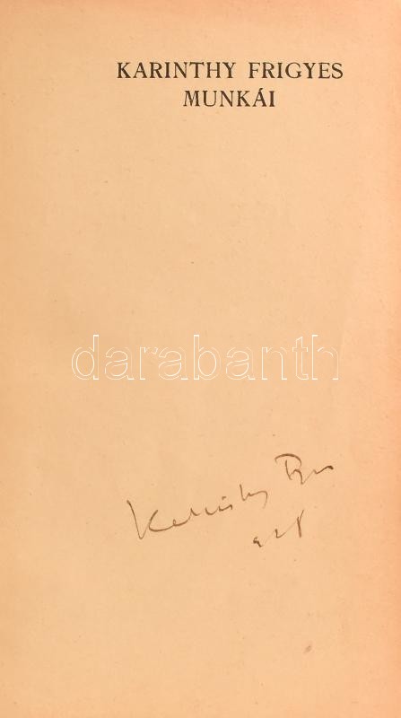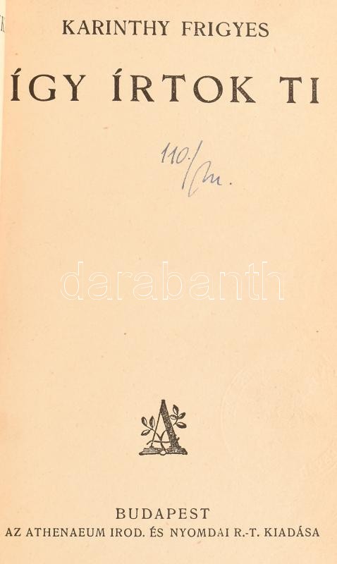 Karinthy Frigyes: Így írtok ti. A szerző, Karinthy Frigyes (1887-1938) által aláírt példány. Karinthy Frigyes Munkái I. köt. Bp., én., Athenaeum, 373 p. Kiadói aranyozott egészvászon-kötés, kopott borítóval, kissé sérült, javított gerinccel.
