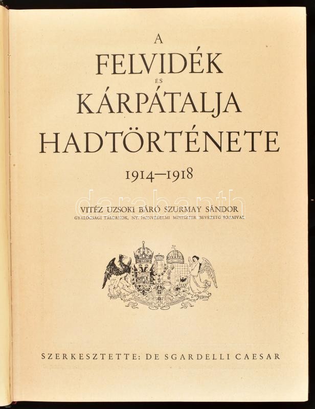 A Felvidék és Kárpátalja hadtörténete. 1914-1918. Vitéz uzsoki Báró Szurmay Sándor bevezetÅ‘ soraival. Szerk.: De Sgardelli Caesar. Bp.,(1940), Athenaeum, 1 t. (Horthy Miklós szÃnes portréja, cÃmkép)+441 p. Szövegközti fekete-fehér fotókkal, térképekkel illusztrálva. A 289-379. oldal között a tisztek és tisztjelöltek névsorával, életrajzukkal, a 381-441. oldal között a tisztek és tisztjelöltek fekete-fehér fotóival. Kiadói aranyozott egészvászon-kötés, szép, gyűjtÅ‘i állapotban.