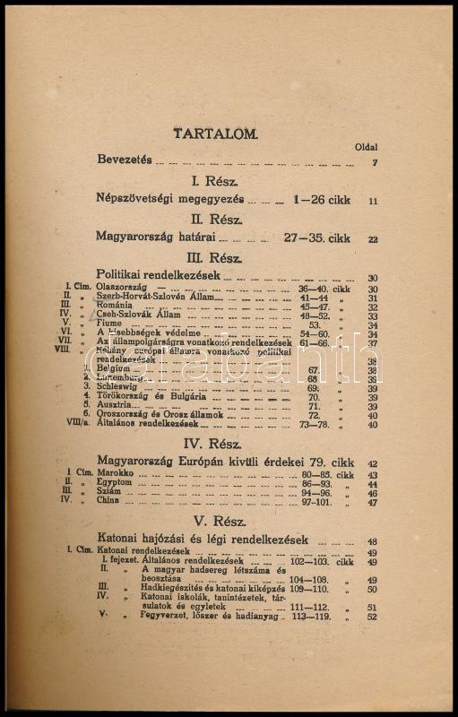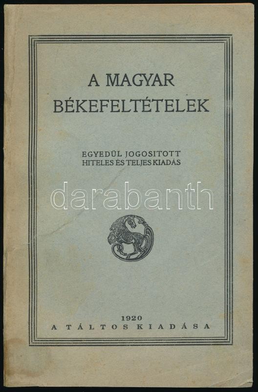 A Magyar Békefeltételek. Egyedül jogosított hiteles és teljes kiadás. [Budapest], 1920. Táltos. 194 p.Kiadói, restaurált papírkötésben. A trianoni béke teljes anyaga