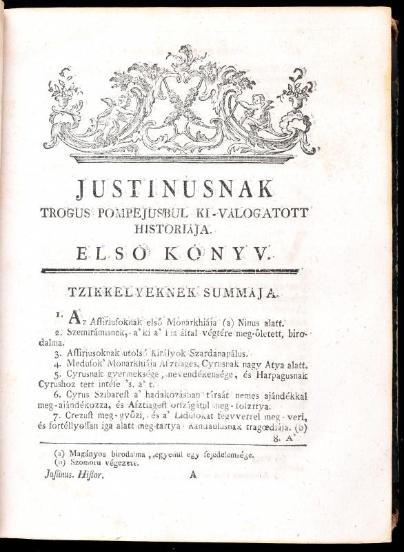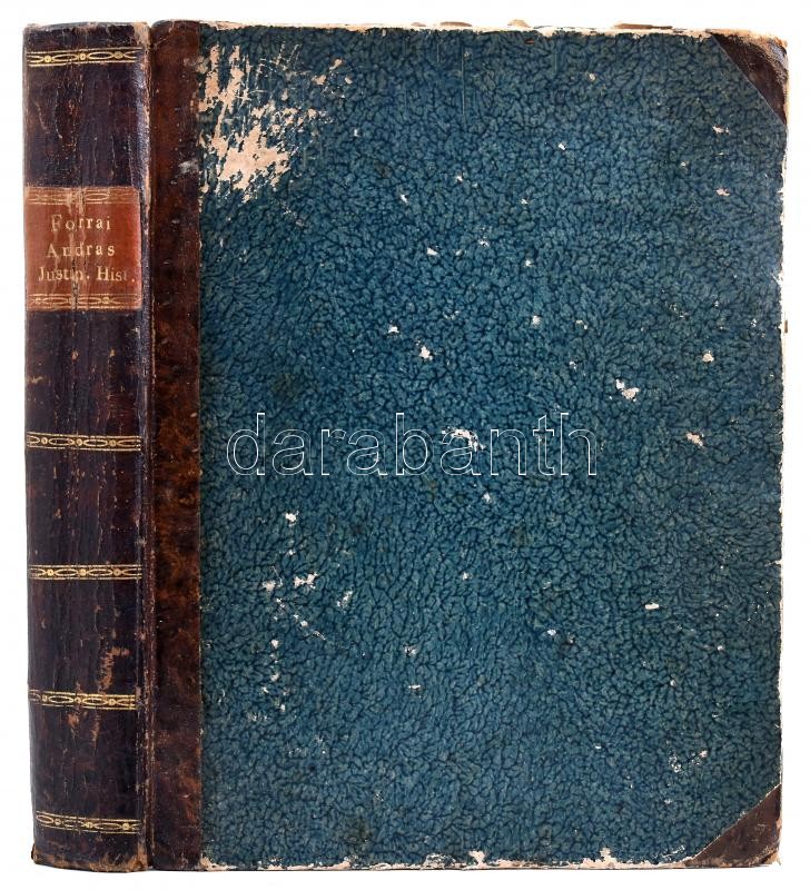 [Justinus, Marcus Junianus]: Justinusnak Trogus Pompejus negyven négy Könyveibül ki-válogatott rövid ékes historiája, mellyet A' Magyar Nemzetnek, és a' kik a' magyar nyelvet tanúlni, vagy gyakorlani kivánnyák kedvekért Deák nyelvbül Magyarra fordított Soborsiny Forrai András, Szent István jeles Rendinek kisebb Kereszt viselő Tagja, Felséges Apostoli Királyunk' Tanátsosa, és Tekintetes Nemes Arad Vármegyének első Vice Ispánnya 1781dik Esztendőben. Egerben, 1781., Nyomtattatot a' Püspöki Oskola betűivel, 8+437+11 p. Korabeli aranyozott gerincű félbőr-kötés, kopott borítóval, foltos lapokkal, a második lapon szöveget nem érintő lyukkal, a címlapon bejegyzésnyomokkal, a hátsó szennylapon régi bélyegzéssel.