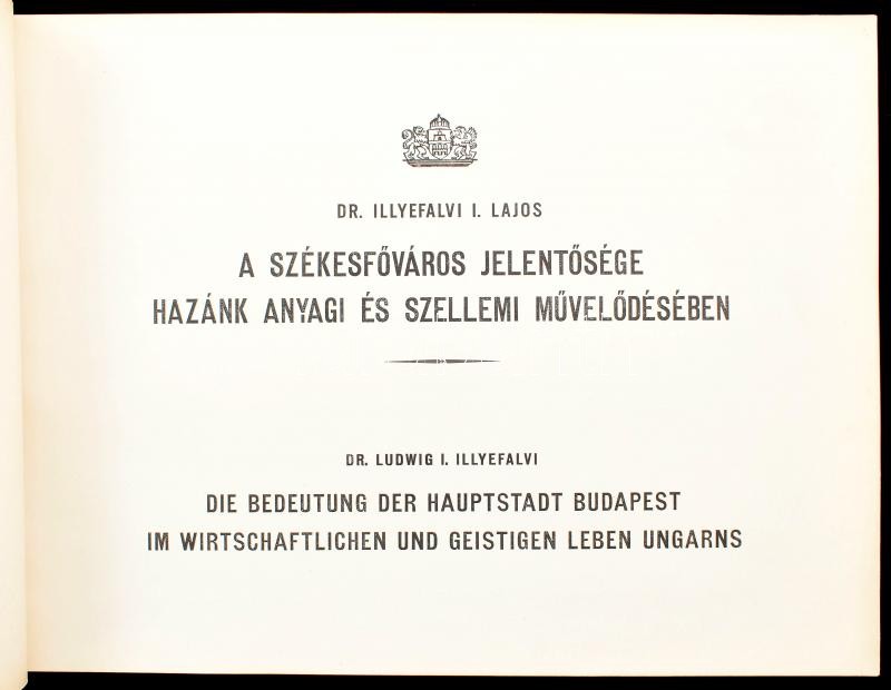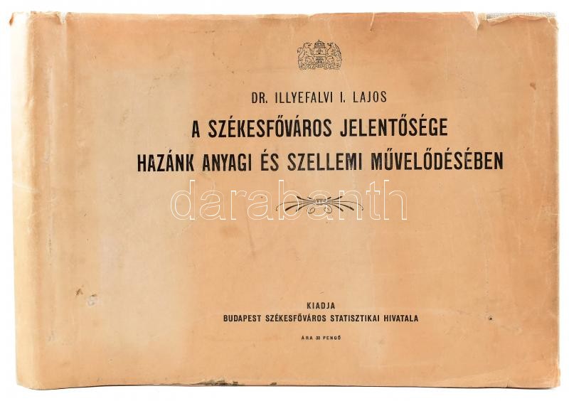 Illyefalvi I. Lajos: A Székesfőváros jelentősége hazánk anyagi és szellemi művelődésében. Bp.,1940., Budapest Székesfőváros Statisztikai Hivatala, X p.+15 t. Kiadói haránt alakú, zsinórral átfűzött, kiadói szakadt, karcos, kissé foltos papír védőborítóban, az elülső kötéstábla egyik élén kopásnyommal, de egyébként jó állapotban.