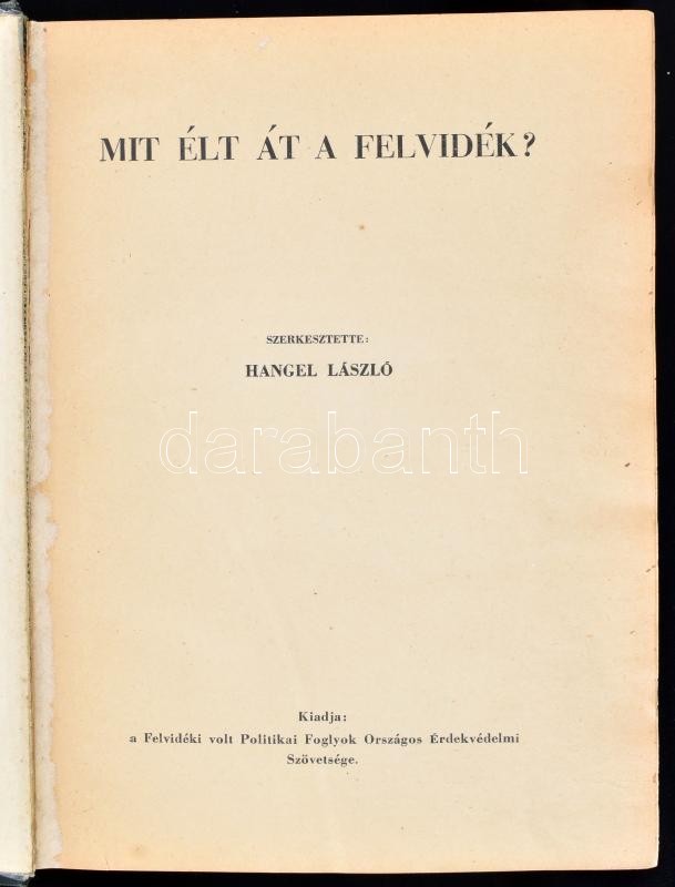 Mit élt át a Felvidék? Szerk.: Hangel László. Bp.,[1940], Felvidéki volt Politikai Foglyok Országos Érdekvédelmi Szövetsége, (Fővárosi-ny.), 686 p. Szövegközti fekete-fehér képanyaggal illusztrált. Kiadói kopott egészvászon-kötés, kissé foltos lapélekkel.