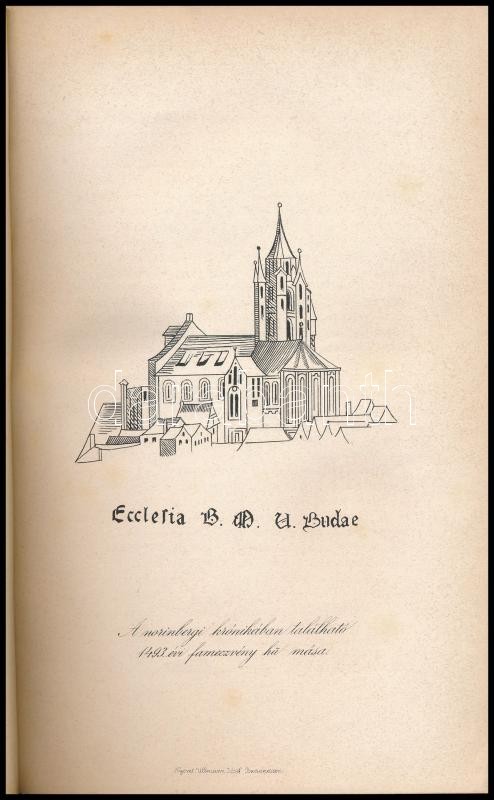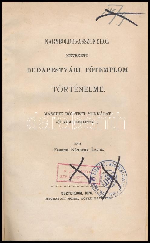 Némethy Lajos, némethi: Nagyboldogasszonyról nevezett budapestvári főtemplom történelme. Második bővitett munkálat. Második, bővített munkálat. (Öt műmelléklettel.) Esztergom, 1876., Horák Egyed, 1 t. +239+1 p.+3 t. + 1 (Budai főegyház alaprajza, kihajtható) t. A kötet a kőnyomatú táblák mellett tartalmazza Rohbock acélmetszetét is. Későbbi átkötött aranyozott gerincű félvászon-kötés, kissé kopott borítóval, a címlapon intézményi bélyegzőkkel, kissé foltos lapokkal, egy foltos táblával.