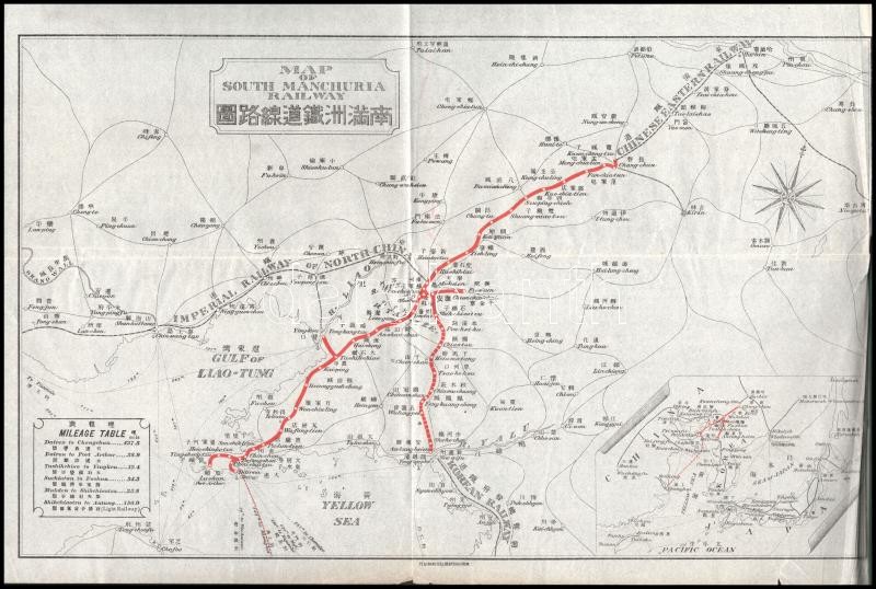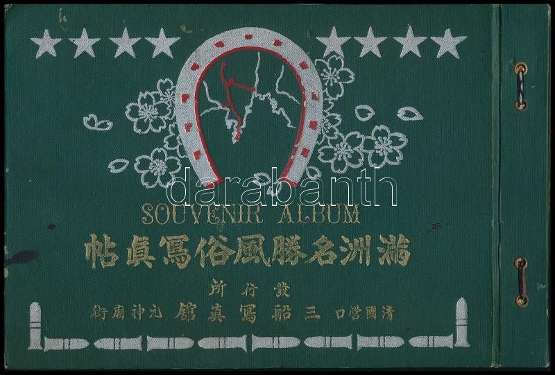 cca 1930 [Mandzsúriai] Souvenir Album. A Mandzsúriai vasúttársaság által kiadott propaganda-turisztikai album. Benne rendkívül érdekes korabeli fotókkal, állomásokkal, életképekkel, városokkal, és kivégzésekkel is. Kiadói haránt-alakú illusztrált egészvászon-kötés, kissé kopott, foltos borítóval, javított fűzéssel,az első és az utolsó lapon szakadásokkal, a térképen szakadásokkal, 1+49(fekete-fehér fotókat tartalmazó kétoldalas lapok) sztl. lev. +1 (Map of South Manchuria Railway, kihajtható térkép,24x36 cm) t.
