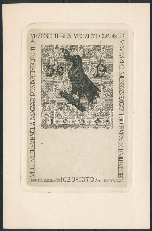 Leírás: 1929-1979 50P okmánybélyeg rézkarc terve Légrády Sándor 50 éves munkássága emlékére készült emléklap barna színben / souvenir card