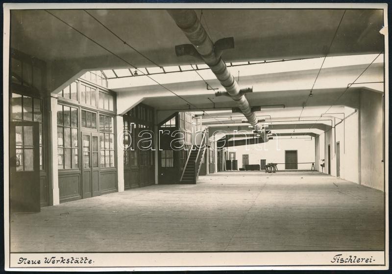 1911 Az újonnan épített asztalosműhelycsarnok a Bécs melletti Fischamend k.u.k. repülőgépgyárban, feliratozott eredeti fotó, kis sérüléssel, 12×17 cm / Fischamend, carpentry workshop , vintage photo