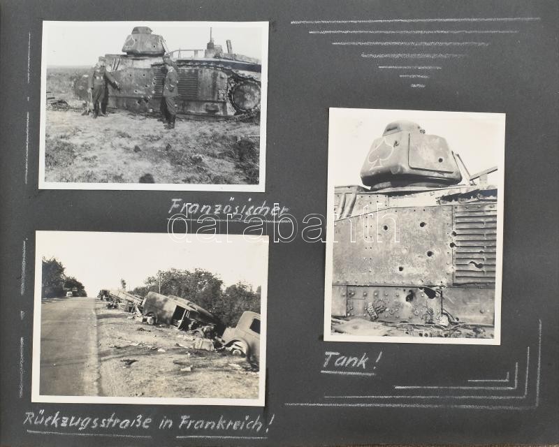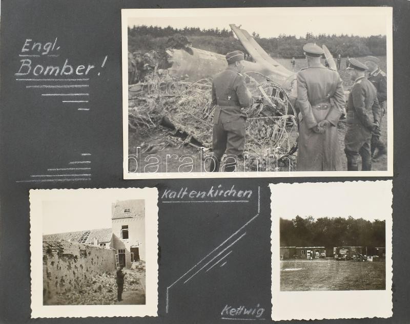 1938-1941 Német katona (Stabsbatterie) által készített fotók az általa megjárt frontvonalakról, albumba rendezve, dátumozva, helységnevekkel feliratozva (Baden, Wien, Ostfront, Düren, Maasbrücken, Kaltenkirchen, Panningen, Medemblick, Amsterdam, Rotterdam, stb.), érdekes témákkal (francia visszavonulási útvonal, szétlőtt hidak a Maas mentén, nyugati földsánc, autópálya, lezuhant repülőgép, szétlőtt épületek, stb.) fotók vegyes méretben / Photos of the front lines taken by a German soldier (Stabsbatterie), photos in album, dated, with place names