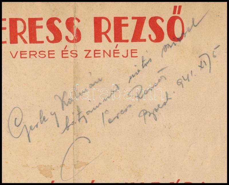 1941 Seress Rezső (1899-1968) zeneszerző, zongorista autográf aláírása, két általa szerzett dal (Gyerünk Bodri kutyám...; Komáromi polgármester leánya) nyomtatott kottáján, kissé foltos, szakadt
