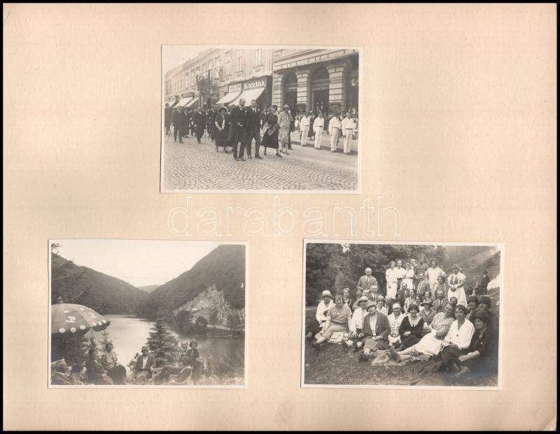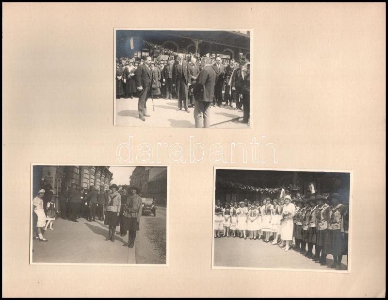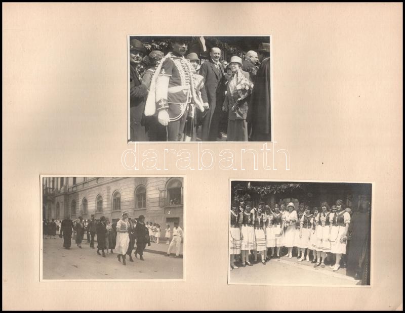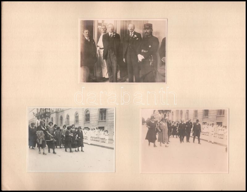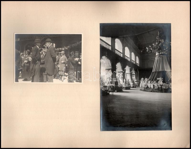 1930 Gregersen Guilbrand (1824-1910) építési vállalkozó lányaihoz köthető fotóalbum, benne a Magyar Iparművészeti és Háziipari Kiállítás és Vásár fotóival és életképekkel, "dr. Toldy Elemérné 1. feleségének testvére: (Gregersen Margit) Gregersen Lujzaé" feliratú kopott, kissé sérült félvászon albumban, benne 48 db fotóval, a fotókon ismert személyekkel is, közte: Klebelsberg Kuno vallás- és közoktatásügyi miniszterrel, valamint József főherceggel, 23x17 cm és 8x11 cm