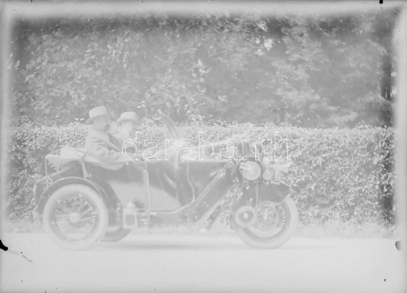cca 1926 Eger, háromkerekű autó/motor (?) botkormánnyal, 1 db vintage NEGATÍV üveglemezen a Foto-GRÁF műterem hagyatékából, 12x16 cm