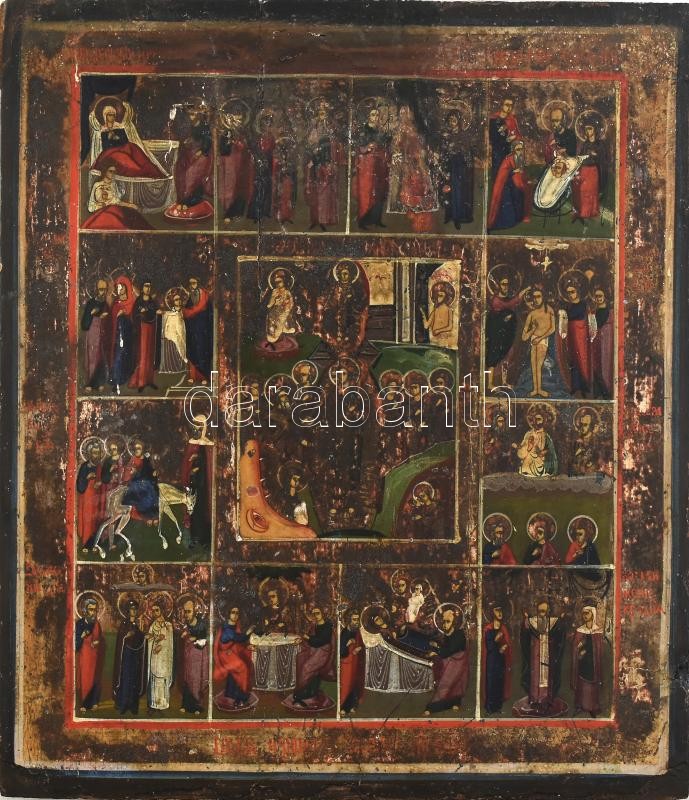 19. századi orosz ikon: Ünnepi ikon. Tojástempera, fa. Sérült. 35,5x31... https://www.darabanth.com/hu/38-Nagyaukcio/38.1/Mutargy-szobor-papirregiseg/Mutargy-antikvitas~15640/19-szazadi-orosz-ikon-Unnepi-ikon-Tojastempera-fa-Serult-35-5x31cm~II2582683