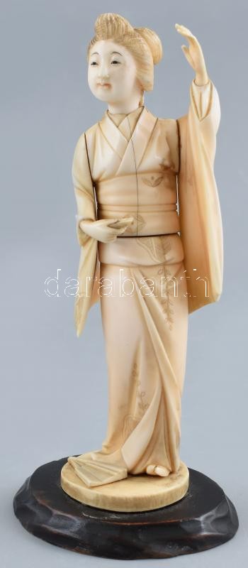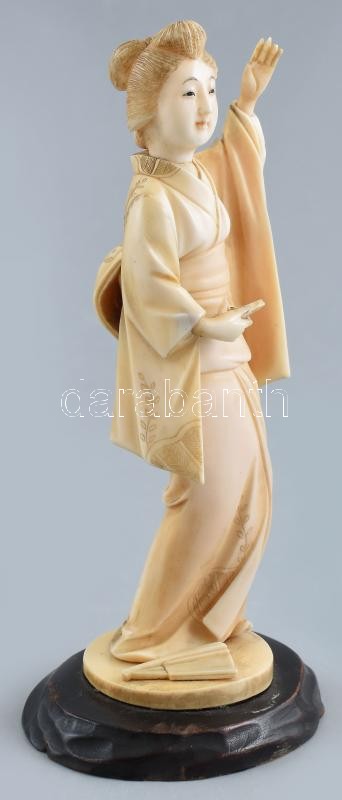 Leírás: Gésa, faragott csont figura, fa talapzaton, m: 17 cm