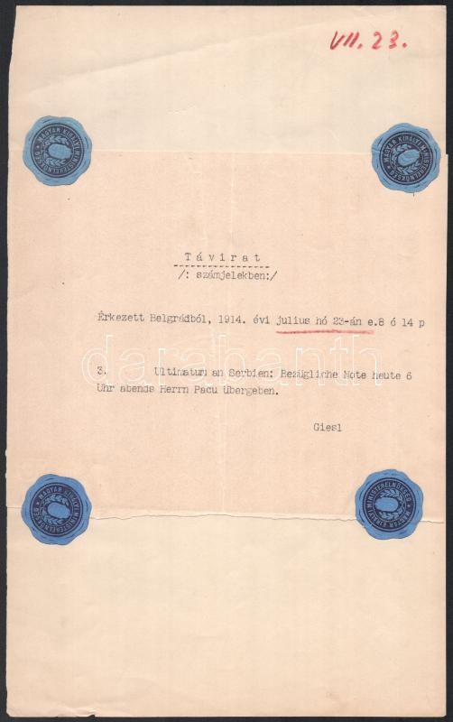 1914 Az Osztrák-Magyar Monarchia nevében a szerb kormánynak az I. világháború kitöréséhez vezető ultimátumot átadó belgrádi nagykövet, Lovag Giesl Vladimír, a magyar miniszterelnöknek július 23-án küldött távirata, melyben értesíti a magyar hatóságot, hogy az ultimátumot átadta. /