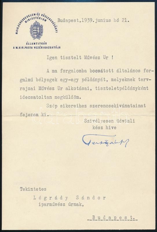 1939 Tersztyánszky Ákos (1876-1956) M. Kir. Posta vezérigazgatójának, a M. Kir. Kereskedelem- és Közlekedésügyi Minisztérium Államtitkárának gépelt levele Légrády Sándor (1906-1987) grafikus részére, hogy a megjelent bélyegek tiszteletpéldányait megküldi, fejléces papíron, Tersztyánszky Ákos saját kezű aláírásával, 1939. jun. 21., borítékkal.