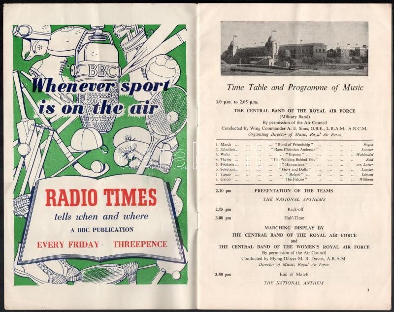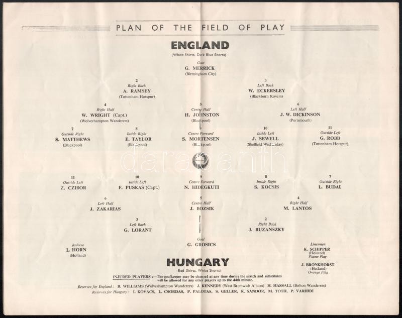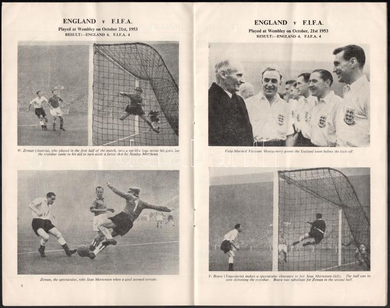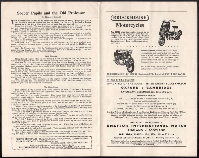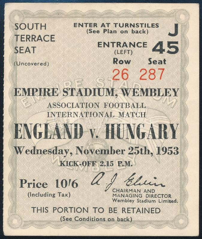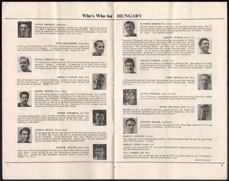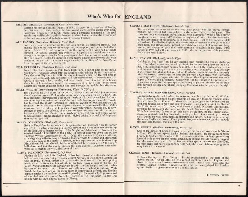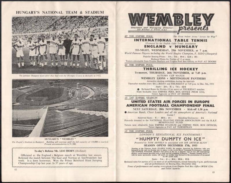 1953 Magyarország-Anglia, a legendás 6:3-as labdarúgó mérkőzés meccsfüzete, és egy belépőjegy a Wembley Stadionba, ahol az Aranycsapat legyőzte az évtizedek óta veretlen Angliát. Szép állapotban. / 1953 Hungary - England 6:3, legendary football match booklet, and an entry ticket to the Wembley Stadium, where the Golden Team of Hungary defeated England. In good condition.