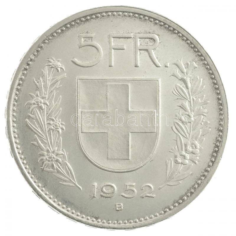 Switzerlan... https://www.darabanth.com/hu/38-Nagyaukcio/38.1/Numizmatika/Kulfoldi-fem-es-ezustpenzek~15948/Svajc-1952B-5Fr-Ag-14-97g-A-legritkabb-evszam-T1--Switzerland-1952B-5-Francs-Ag-14-97~II2569288