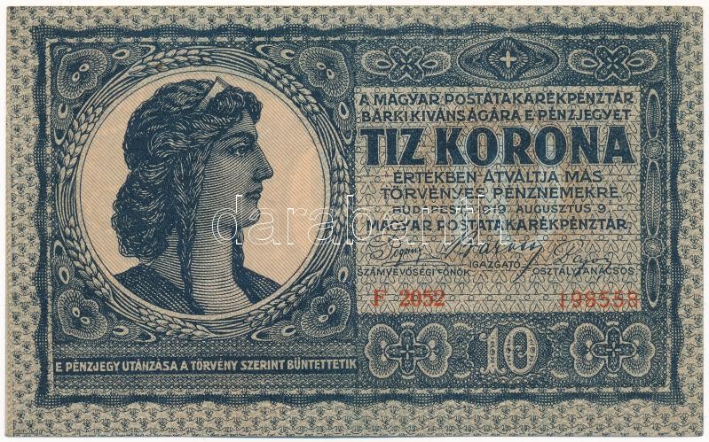 Leírás: 1919. augusztus 9. 10K "F 2052 198558" T:II- / Hungary 9th August 1919. 10 Korona "F 2052 198558" C:VF