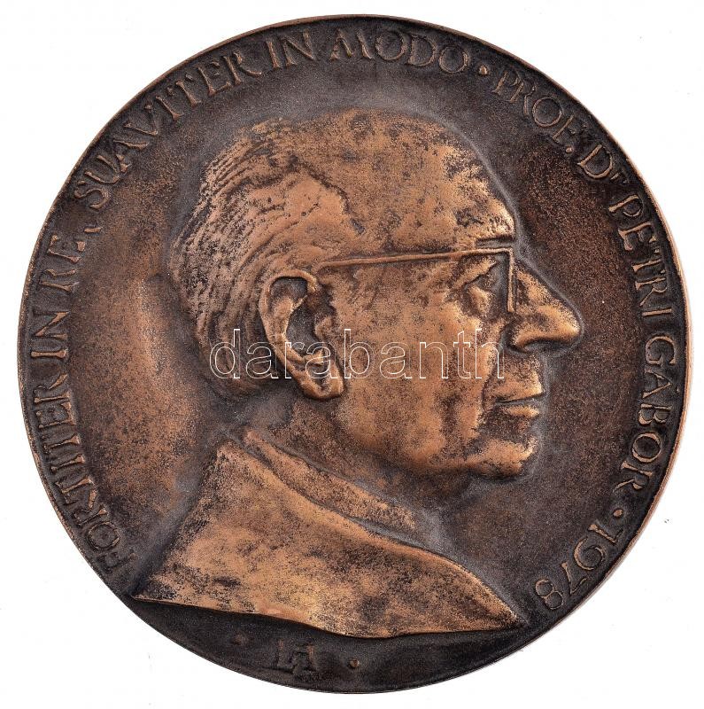Lapis András (1942-) 1978. "Prof. Dr. Petri Gábor 1978 - Fortiter In Re Suaviter In Modo/ Professzori kinevezésének 25. évfordulójára, tanítványai" kétoldalas, öntött bronz emlékérem (109mm) T:2 patina /