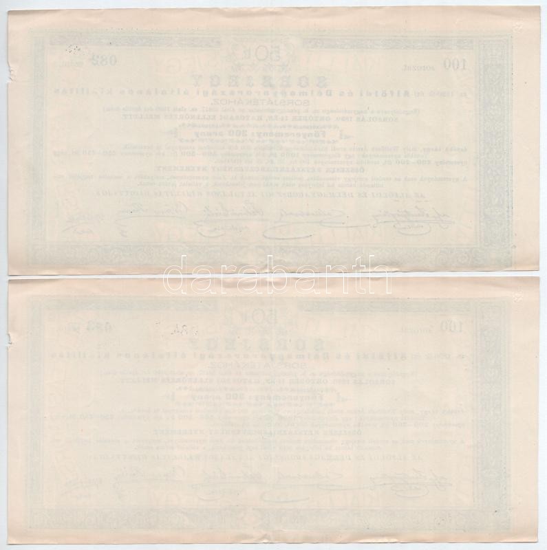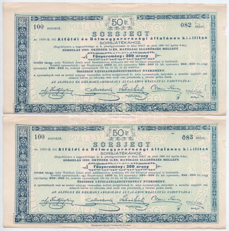 Arad 1890. "Alföldi és Délmagyarországi általános kiállítás" sorsjegy 50kr értékben (2x) sorszámkövetők T:III / Hungary / Arad 1890. "General Exhibition of the Great Plain and Southern Hungary" lottery ticket in 50 Kreuzer value (2x) consecutive serials C:F