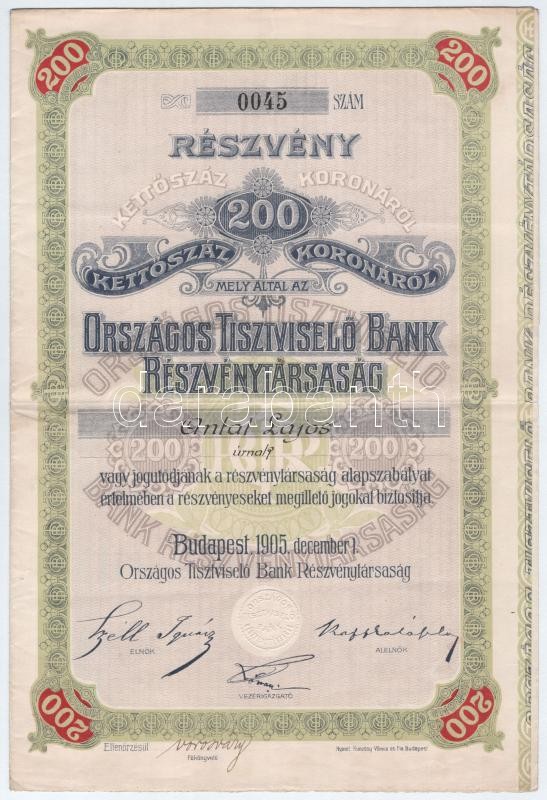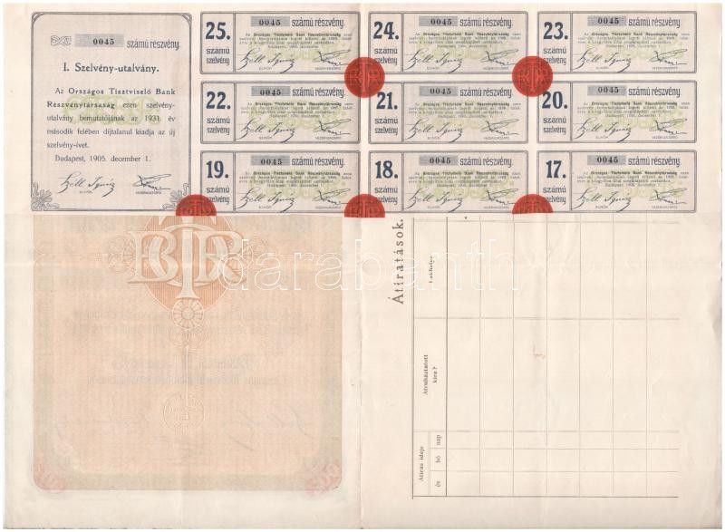 Budapest 1905. "Országos Tisztviselői Bank Részvénytársaság" részvénye 200K-ról szelvényekkel, szárazpecséttel T:III / Hungary / Budapest 1905. "Országos Tisztviselői Bank Részvénytársaság (National Officials Bank Share Company)" share about 200 Korona with coupons and with embossed stamp C:F