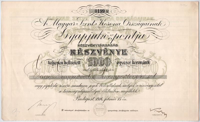 Budapest 1916. "A Magyar Szent Korona Országainak Gyapjúközpontja Részvénytársaság" névre szóló részvénye 1000K-ról szelvényekkel T:I- / Hungary / Budapest 1916. "The Wool Center of the Hungarian Holy Crown Countries Share Company" share about 1000 Kronen with coupons C:AU