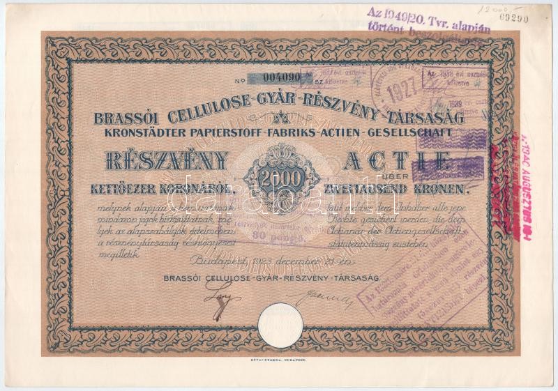Budapest 1923. "Brassói Cellulose-Gyár-Részvény-Társaság" részvénye 2000K-ról szelvényekkel, német és magyar nyelven bélyegzésekkel, szelvényekkel T:I- / Hungary / Budapest 1923. "Brasov Cellulose Factory Share Company" share about 2000 Kronen, with coupons, in German and Hungarian, with coupons and cancellation C:AU