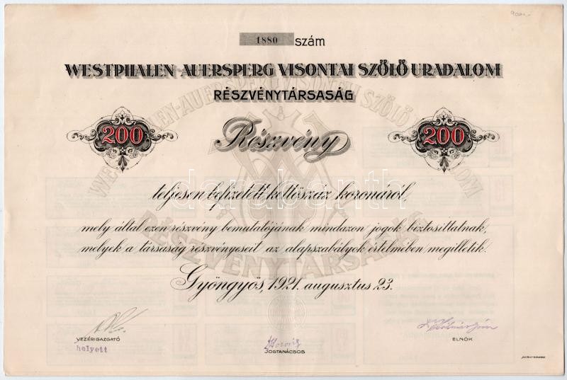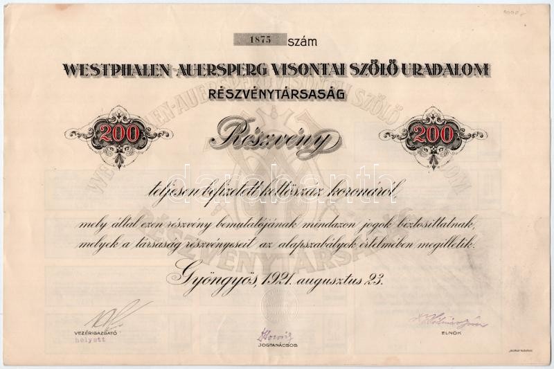 Gyöngyös 1921. "Westphalen-Auersperg Visontai Szőlő Uradalom Rész... https://www.darabanth.com/hu/38-Nagyaukcio/38.1/Numizmatika/Reszvenyek-sorsjegyek-es-szuksegpenzek~15952/Gyongyos-1921-Westphalen-Auersperg-Visontai-Szolo-Uradalom-Reszvenytarsasag-reszvenye-2~II2579988