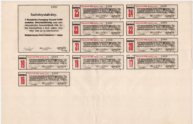 Leírás: Gyöngyös 1921. "Westphalen-Auersperg Visontai Szőlő Uradalom Részvénytársaság" részvénye 200K-ról (2x) közeli sorszámokkal T:II,II- / Hungary / Gyöngyös 1921. "Westphalen-Auersperg Visonta Grape State Share Company" share about 200 Kronen (2x) with close serials C:XF,VF