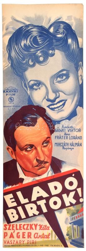 Eladó birtok! Moziplakát (filmplakát, rácsplakát), 1940-41. Szeleczky Zita, Páger Antal, Vaszary Piri szereplésével. Rendezte: Bánky Viktor. Zene: Fráter Loránd. Mikszáth Kálmán regénye. Litográfia, papír. Rovenszky Pázmány lito. Kárpát Film. Kováts Béla Filmreklám Vállalat. Jó állapotban. 84×30 cm / Vintage Hungarian movie poster, in good condition, lithography on paper.