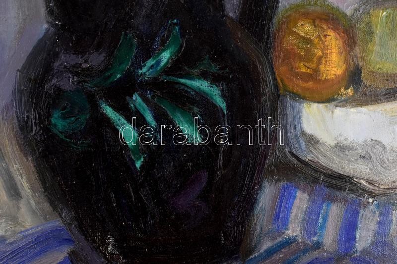 Leírás: Farkas Lajos (1919-1998): Csendélet. Olaj, vászon, jelzett. Kissé sérült fa keretben, 61×50,5 cm