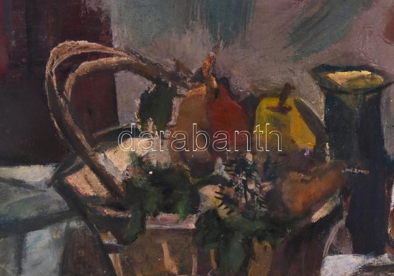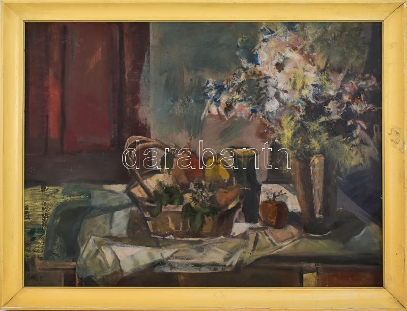 Leírás: Gaál Imre Péter (1921-2013): Csendélet. Olaj, farost, jelzett. Hátoldalán Képcsarnok Vállalat kissé töredékes címkéjével, üvegezett keretben, 60x80 cm