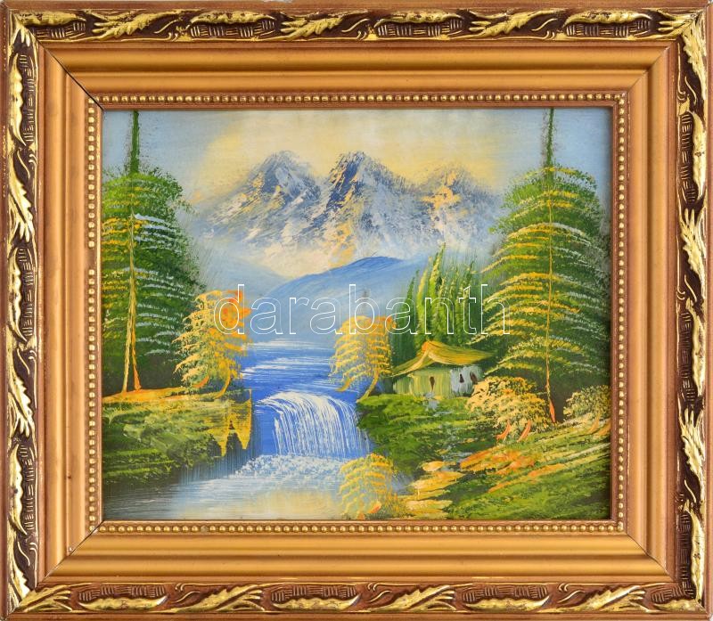 Leírás: Jelzés nélkül: Hegyvidéki táj. Olaj, vászon. Díszes fa keretben. 20x25,5 cm