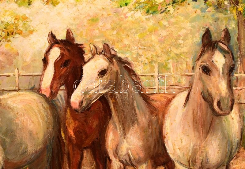 Leírás: Nagy N J jelzéssel: Lovak. Olaj, karton, fa keretben, 57,5×49,5 cm