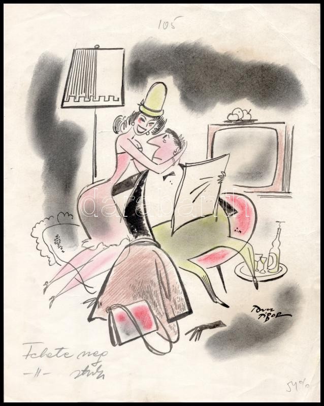 Toncz Tibor (1905-1979): Előrelátás (karikatúra). Akvarell, tus, papír, jelzett, hátoldalán Ludas Matyi szerkesztősége pecséttel. Lap kissé gyűrött. 29x22 cm