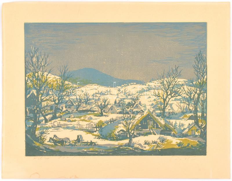 Leírás: Török Endre (1926-1980): Pilis. Színes linómetszet, papír, jelzett, számozott (100/54), lap alja kissé foltos, 29×39 cm