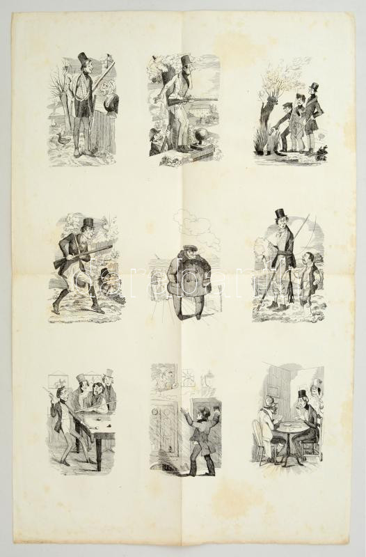 Leírás: 1800 9 db humoros angol könyvillusztrációk. Litográfia egy íven 50x33 cm