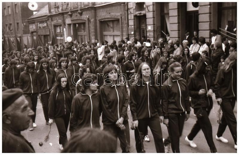 Leírás: 1973 Budapest, május elsejei felvonulás, 9 db negatív kocka csíkban