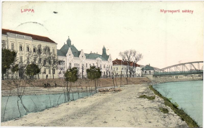 Leírás: Lippa, Lipova; Maros parti sétány, Polgári és kereskedelmi iskola / promenade, school