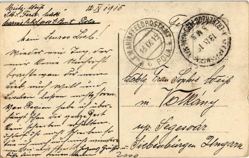 1915 Versenkung des italienischen Panzerkreuzers 'Giuseppe Garibaldi' durch ein oesterr.-ung. Unterseeboot / Az Olasz Királyi Haditengerészet 'Giuseppe Garibaldi' páncélos cirkáló elsüllyesztése osztrák-magyar tengeralattjáró által / WWI Sinking of the Royal Italian Navy's armored cruiser ship by the submarine of the Austro-Hungarian Navy. K.u.K. Kriegsmarine. s: Willy Stöwer + "K.U.K. KRIEGSMARINE SMS ERZHERZOG FERDINAND MAX"