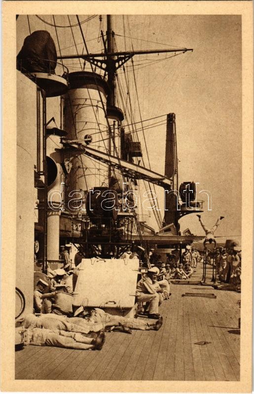 Leírás: SMS Tegetthoff az Osztrák-Magyar Haditengerészet Tegetthoff-osztályú csatahajója, matrózok pihenőideje a fedélzeten / K.u.K. Kriegsmarine SM Schiff "Tegetthoff", Ruhepause / Austro-Hungarian Navy Tegetthoff-class battleship, mariners resting on board. Phot. A. Hauger 1916 Nr.1051.