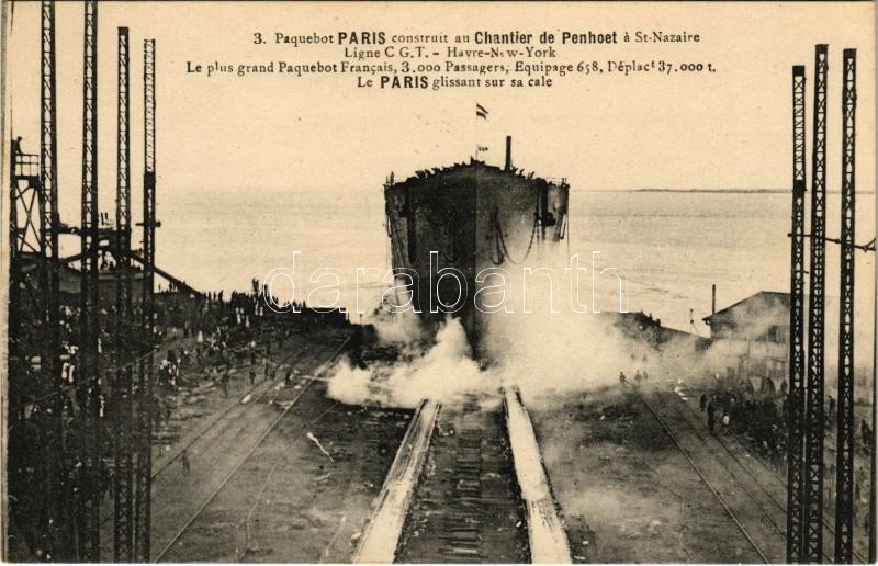 Paquebot Paris construit au Chantier de Penhoet a St. Nazaire Ligne C.... https://www.darabanth.com/hu/381-Gyorsarveres/381.0/Kepeslapok/Hajo~1500052/Paquebot-Paris-construit-au-Chantier-de-Penhoet-a-St-Nazaire-Ligne-CGT-Havre-New-York-Launchin~II2194624