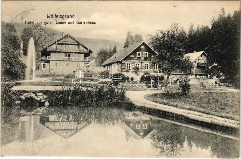 Leírás: 1909 Miedzygórze, Wölfelsgrund; Hotel zur guten Laune und Gartenhaus / hotel, garden, fountain. Verlag A. Walzel